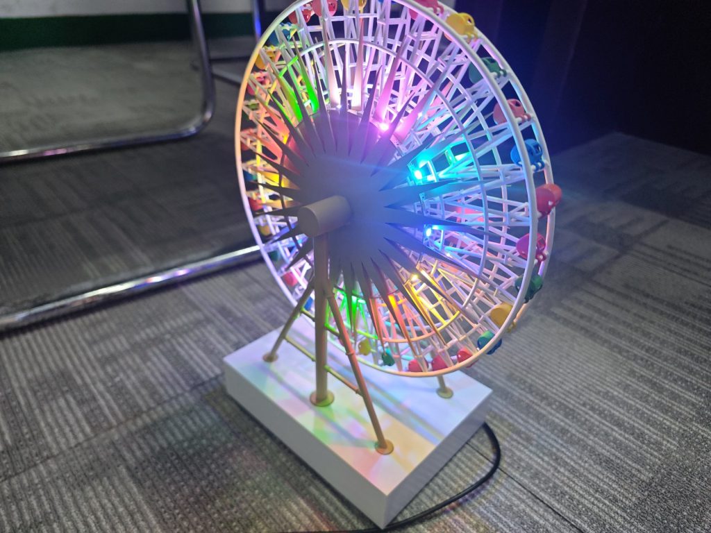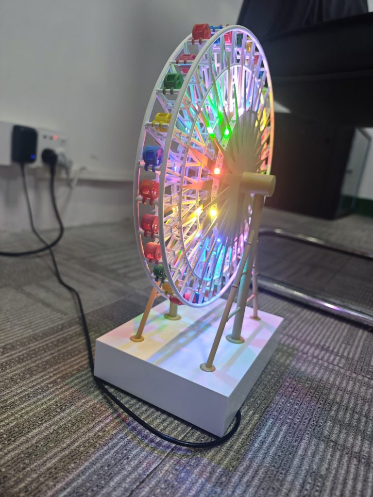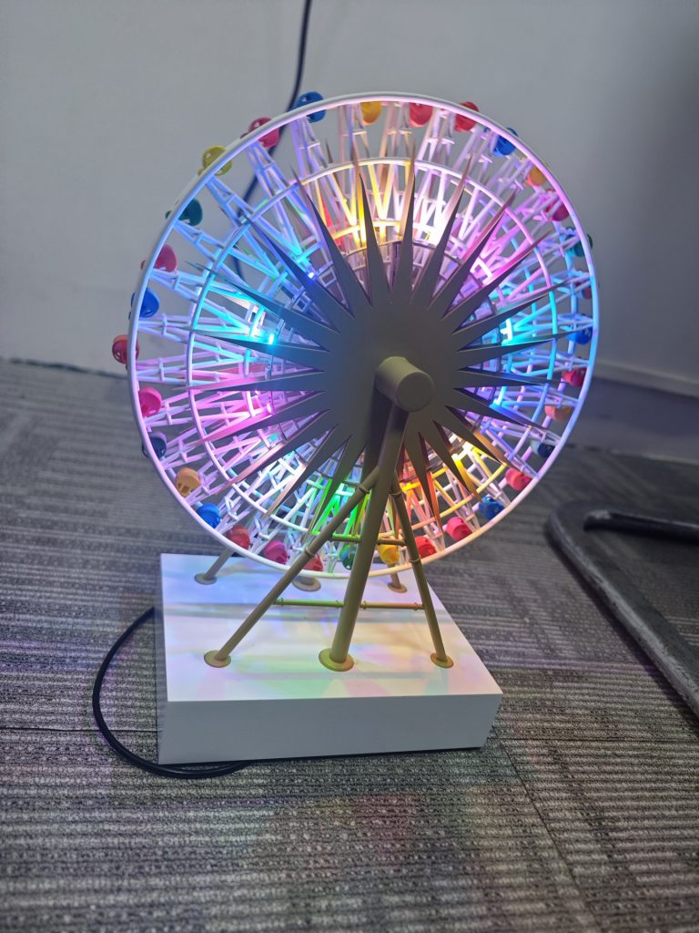 A button battery box and a simple switch are installed inside the base, and wires are threaded out of the bracket to connect to the collector ring. The switch is set on the side of the base, and when pressed, the light cycle switches between red, green, blue, yellow and other colors, simulating the colorful lighting effects in the picture.
