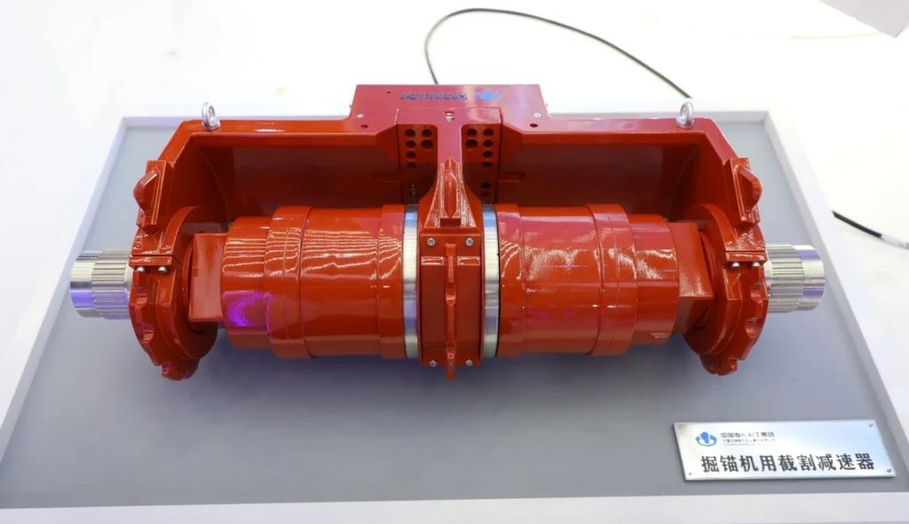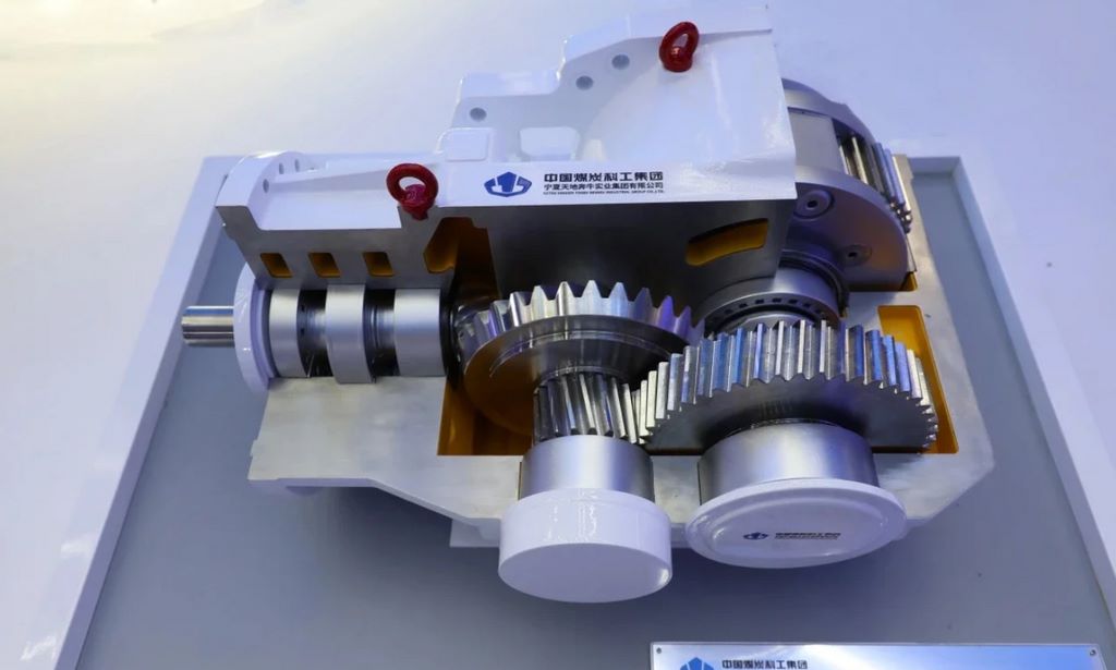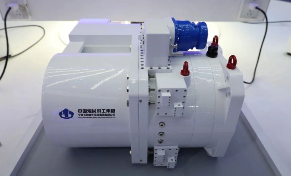 Core objective: Accurately reproduce the large-scale coal industry equipment model shown in the picture, focusing on its pure white industrial paint surface, precise enterprise logo printing, and blue and red embellished mechanical details, pursuing a authenticity of over 90%.